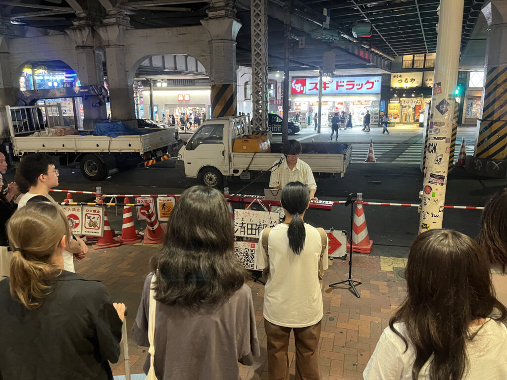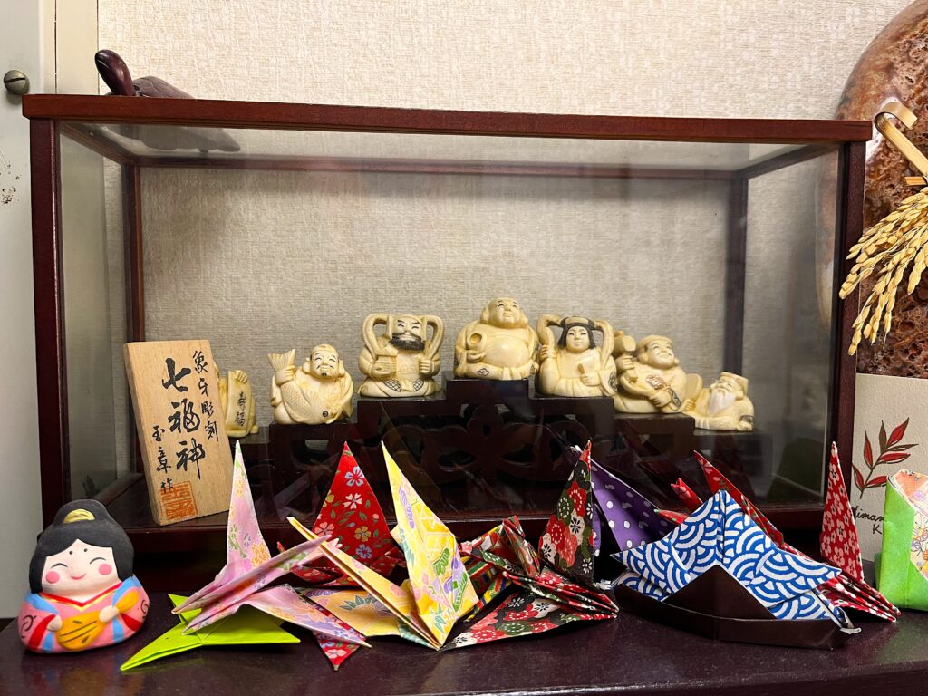 À la sortie de Ueno Station, je me joins à quelques spectateurs qui font face à un chanteur de rue à la voix aigüe. Il s’est installé devant son synthétiseur, près d’un chantier à l’arrêt, sous la voie ferrée. Le fond sonore ne le perturbe pas. Il fait chaud et humide. J’ai très soif. Je ne m’éternise pas et pars vers le Parc Ueno voisin qu’il me faut traverser pour rejoindre mon auberge, appelée ryokan, りよかん en japonais. Dans les allées, le chant des grillons – les suzumushis, すずむし- m’accompagne. J’ai lu que c’est à l’approche de l’automne que leur petite musique résonne le plus et que les Japonais s’intéressent depuis des siècles au chant de ces insectes comme à celui des cigales. Il paraît qu’il n’est pas rare à Tokyo, vers la fin de l’été, de voir des gens placer quelques suzumushis dans une petite cage en bambou installée devant leur fenêtre et profiter de leur concert. Rien de tel dans mon ryokan. Le chant des grillons est moins présent dans ce quartier. En arrivant, je découvre sur une étagère des statuettes représentant sept Bouddhas, une petite poupée rieuse qui ressemble à un santon joufflu et de jolis origamis, おりがみ. Le sens japonais de l’accueil n’est pas une légende.