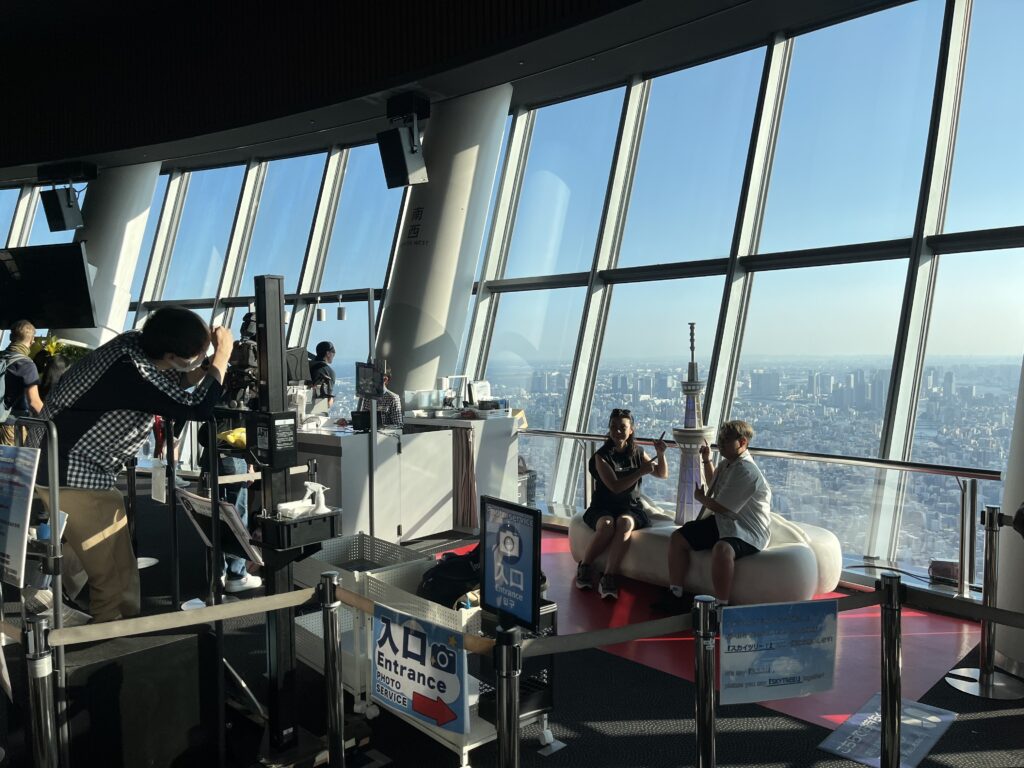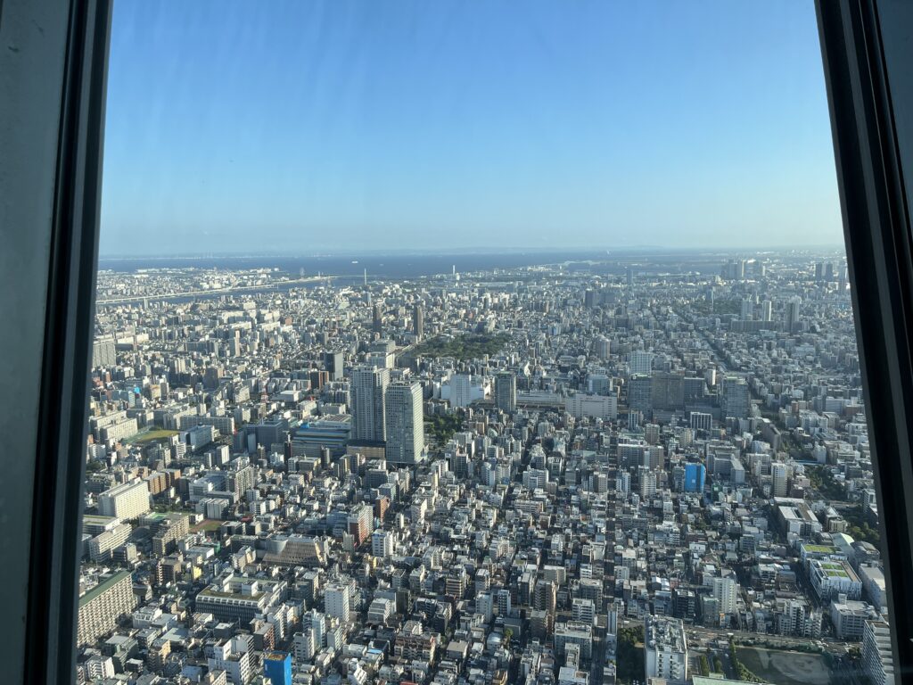 Un clic et c’est dans la boîte. Après une montée en ascenseur à la vitesse de 600 mètres par minute, un moulon de touristes viennent s’asseoir à la queue leu leu sur un sofa blanc écru et poser, sourires figés, devant la maquette de la géante Skytree. Derrière eux, une baie vitrée circulaire donne sur les toits de Tokyo. Depuis le Tembo Deck, le premier observatoire accessible, à 350 mètres au-dessus du sol, la vue offerte sur la ville est panoramique à 360°. La capitale du Japon se laisse découvrir dans toute son immensité, jusqu’à son port.