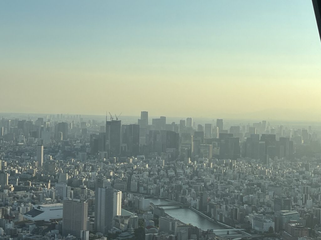 Il fait beau mais l’horizon est teinté d’un voile de brume et de pollution bleu orangé pâle. Au-delà du fleuve Sumida et des gratte-ciels, je devine à peine le Mont Fuji, là-bas, à une centaine de kilomètres de Tokyo à vol d’oiseau. Demain, je m’en rapprocherai enfin et tout bientôt je serai à ses pieds.